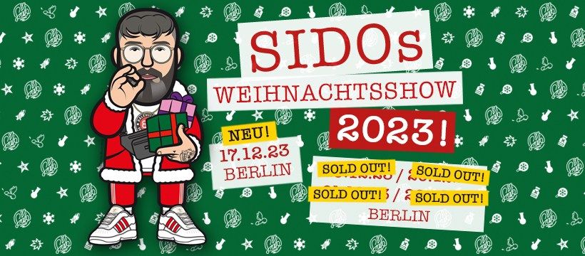 sido weihnachtsshow 2024 – Sido begibt sich vom 06.07.2024 bis zum 15.08.2024 auf Tour. Für die Veranstaltungsreihe mit dem Namen “Sido – Live Mit Dir Open Air 2024” macht er unter anderem in Kitzingen bei Würzburg, Bergen auf . Gleich zehnmal bittet Deutschrap-Held Sido diesen Monat zu seiner „Christmasshow“, und gleich zehnmal ist die Columbiahalle „ausverkauft“. Und das Gleiche wird, bereits ein Jahr zuvor, für zwei Weihna .