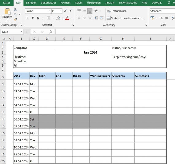Timesheet Working Time to Print Out Yourself, DIN A4 Excel, Pdf